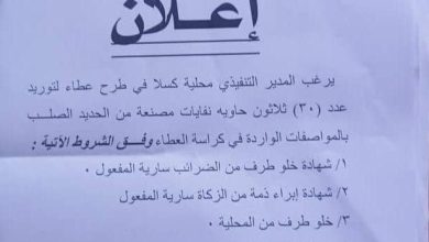 ولاية كسلا محلية كسلا إعلان يرغب المدير التنفيذي محلية كسلا في طرح عطاء لتوريد عدد (30) ثلاثون حاوية نفايات مصنعة…