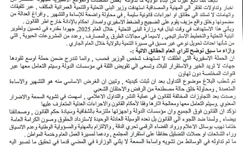 ان الحملة الإسفيرية التي اطلقت لاتستهدف شخص الوزير فحسب وأنما تندرج ضمن حملة أوسع تقودها جهات لاتريد الخير والاستقرار للبلاد وتسعي الي تقويض الثقة بمؤسسات الدولة وسيتم التعامل معها عبر القنوات المختصة دون تهاون. تم شطب البلاغ موضوع التداول بعد إن ثبتت كيدته وتبيين أن الغرض الاساسي منه التشهير والإساءة المتعمدة ومحاولة خلق حالة مصنعة من الرفض والاحتقان الشعبي. رصدت بعض التجاوزات والمخالفات للقانون في عملية النشر والتداول الإعلامي أسهمت في تشويه السمعة والأضرار المعنوي وسيتم التعامل معها ومعالجة أثارها وفقا لأحكام القانون والأجراءات العدلية المتعارف عليها. نؤكد أن القانون فوق الجميع وٱن مؤسسات الدولة وأجهزتها ملتزمة بالشفافية وسيادة حكم القانون بيضاء وليس ضد اللجوء للقانون بل نعده الوسيلة العادلة الوحيدة لإسترداد الحقوق وصون الكرامة العامة. ختاما نهيب بوسائل الاعلام ورواد الفضاء الرقمي تحري الدقة والإلتزام في المهنية والمسئولية الوطنية وعدم الإنسياق وراء الشائعات ٱو حملات التضليل حفاظا علي إستقرار المجتمع ودعما لمسيرة العمل وخدمة المواطن. ماتم تداوله في الوسائل من تشويه وٱساءة سمعة لايثني الوزارة في المضي قدما في تحقيق ماتصبوا اليه مجتمعات الولاية من التنمية في مجال الخدمات وبناء الطرق والله ولي التوفيق.